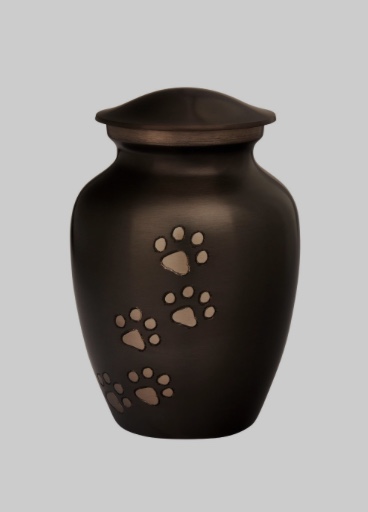 Paw Prints Pet Urn made of brass with dark slate finish. Securely closes with threaded lid. Felt-lined base. |