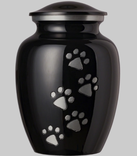 Golden Paws brass pet urn with shiny black finish. Threaded lid allows secure closure. Felt-lined base. |