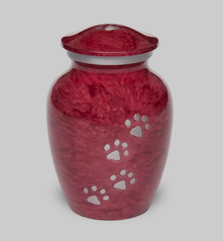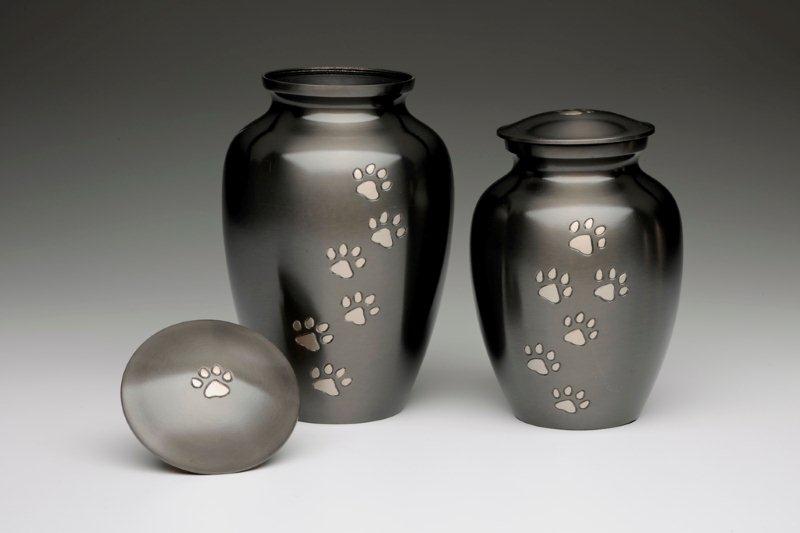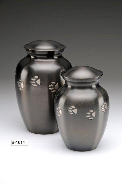 Brass urns with an electroplated finish of pewter. Double paw prints adorn the tops in pewter finish. |