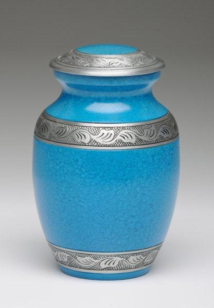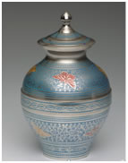 Small Cremation Urn with Beautiful Turquoise Color Finish and Hand-Tooled Antique Pewter Band. Threaded lid allows secure closure. Felt-lined base. |