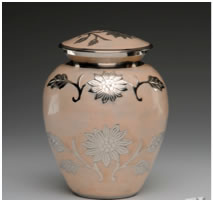 Peach Enamel over Nickel Plated Brass Small Cremation urn. Hand-tooled Flower design. Threaded lid allows secure closure. Felt-lined base. |