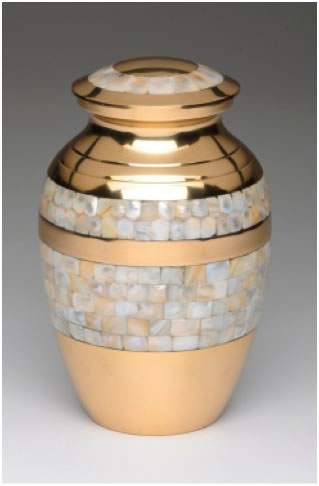 Cremation Urn with Beautiful Mother of Pearl Inlay over Nickel Plated Brass. Threaded lid allows secure closure. Felt-lined base. |