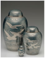 Brass Cremation Keepsake Urn with Nickel Overlay. Beautiful Hand-tooled Design of Three Birds in Flight. Threaded lid allows secure closure. Felt-lined base. Comes with a velvet box. |