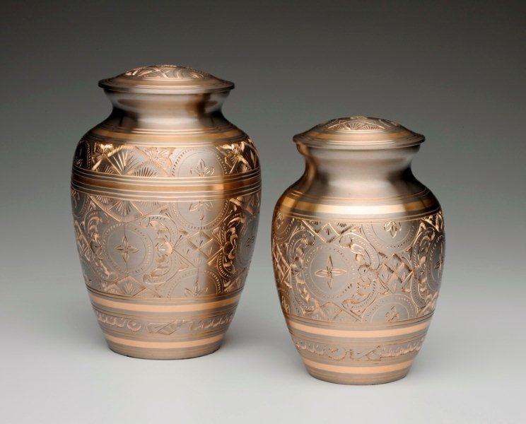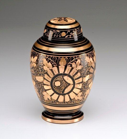 Beautiful brass urn with a copper overlay and raku finish. Securely closes with a threaded lid. Felt-lined base. |