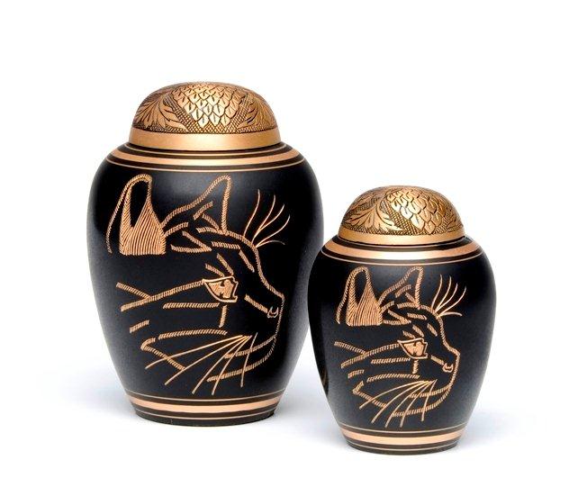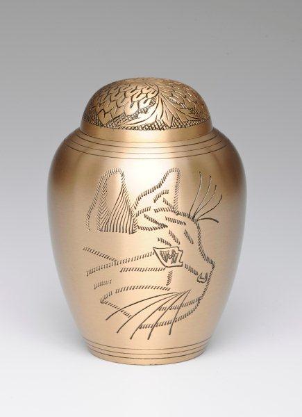 Hand etched solid brass urn meant just for a cat! This urn requires no maintenance and secures with a threaded lid. |