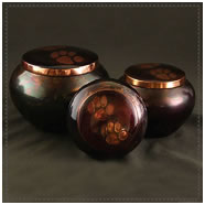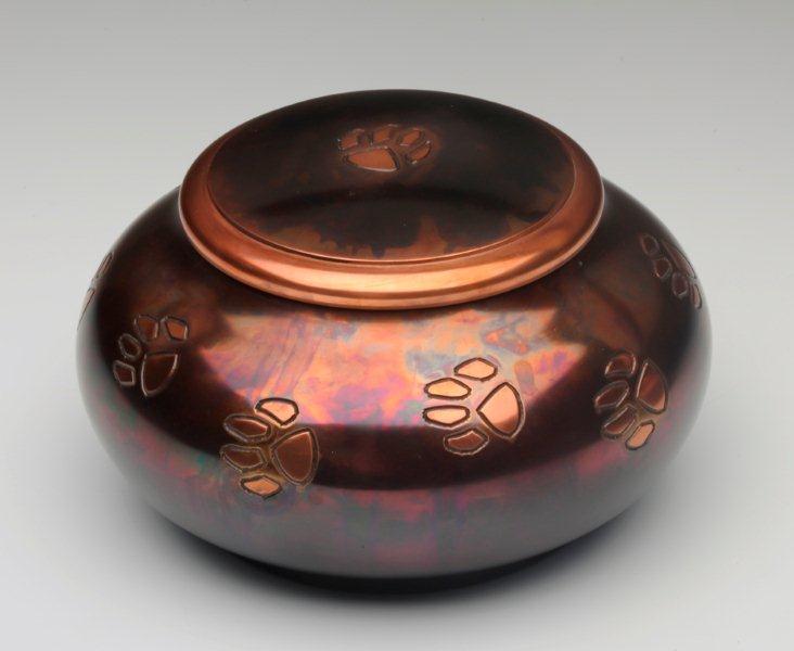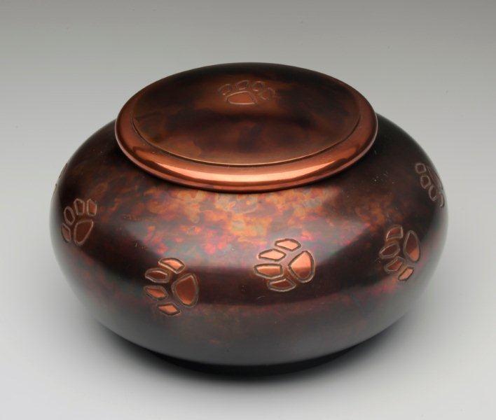 Milano Raku Paw Print Urn, beautiful brass urn with a copper overlay and raku finish. Securely closes with a threaded lid. Felt-lined base. |