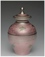 Beautiful Pink Brass Cremation Urn with Nickel Overlay and Hand-Tooled Butterfly Design. Threaded lid allows secure closure. Felt-lined base. |