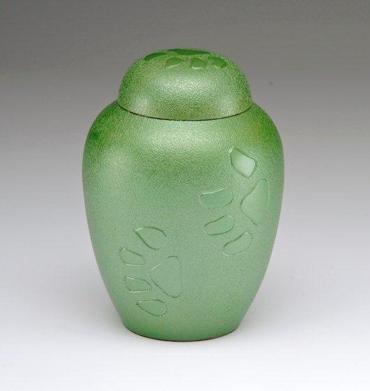 Green Paw Prints Urn - Made of Brass with textured green finish. Securely closes with threaded lid. Felt-lined base. |