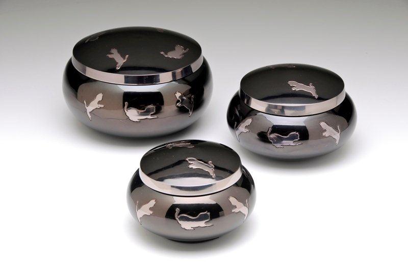 Leaping Cats kitty urn in brass with shiny black color and leaping cat design encircling the urn. |