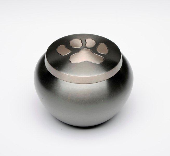 Brass urns with an electroplated finish of pewter. Tiny paw prints adorn the tops in pewter finish. |