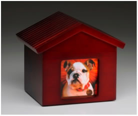 B-015 | Dog House Urn Photo Frame | 7 ½ in. x 5 ¾ in. x 6 ½ | 100 | Medium | $140 | Birch Wood 3.25 in. x 3.25 in. photo frame dog house urn with cherry stain and glass front. Loads from the base and securely closes with four brass screws. Felt pads on each corner. |