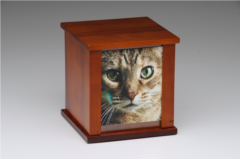 SM-PC06 | Small Cherry Photo Urn | 5 in. L x 3.75" W x 3.5" D. | 25 | Small | $140 | This pet urn is a Small Cherry in color picture frame urn made of MDF wood and has a glass front to showcase a picture. To insert the photo the front slides open without disturbing the cremains. Urn size is 5" L x 3.75" W x 3.5" D. Photo size is 3.5" x 2.25" |